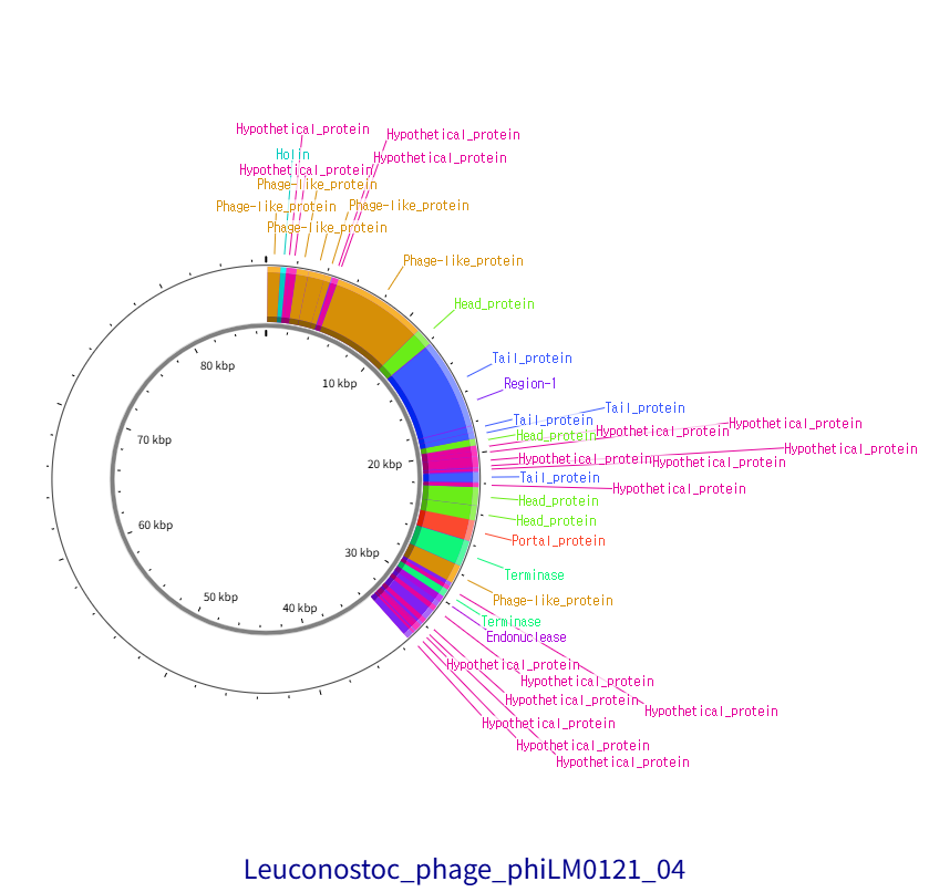 박테리오파지의 Annotation results, Whole Genome Sequence을 설명한 표 입니다.
