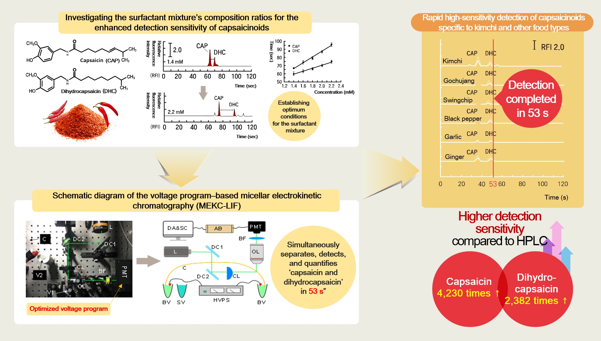 As a result of the experiment, CAP and DHC were simultaneously separated and detected in only 53 s, which shows the improved detection sensitivity of the major pungency components by 4,230 times and 2,382 times, respectively, compared with the conventional HPLC method.