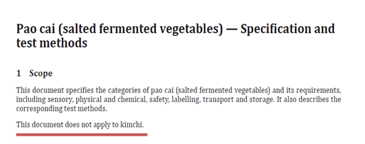 Recently, a Chinese media outlet reported that the industrial standard for ¡®pao cai,¡¯ a Chinese pickled vegetable delicacy, was applied to the international standard for the kimchi industry, which was far from the truth.