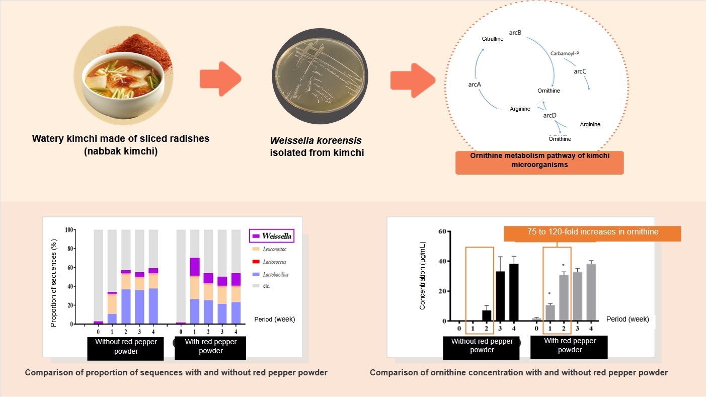 The study confirmed that about 75 to 120 times more ornithine was produced from the microorganisms in Weissella, which were increased by the addition of red pepper powder in the fermentation process for 1 to 2 weeks immediately after the kimchi was made.